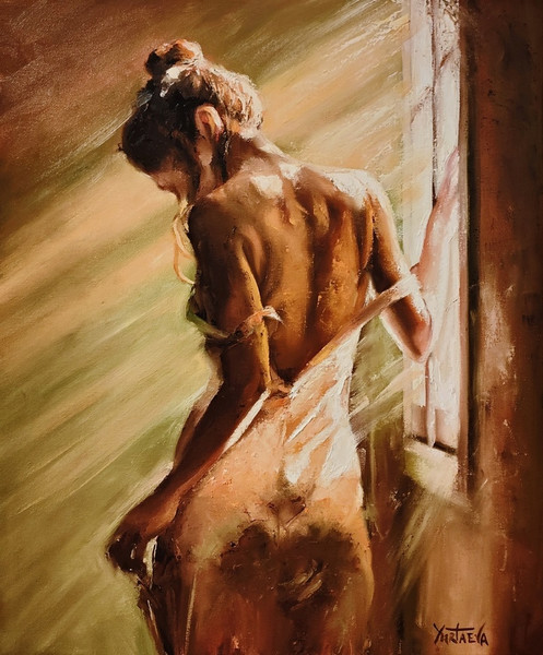 холст масло 50*60см Утренняя нега,девушка стоит у окна и солнечные лучи пронизывают мягким светом ее силуэт...