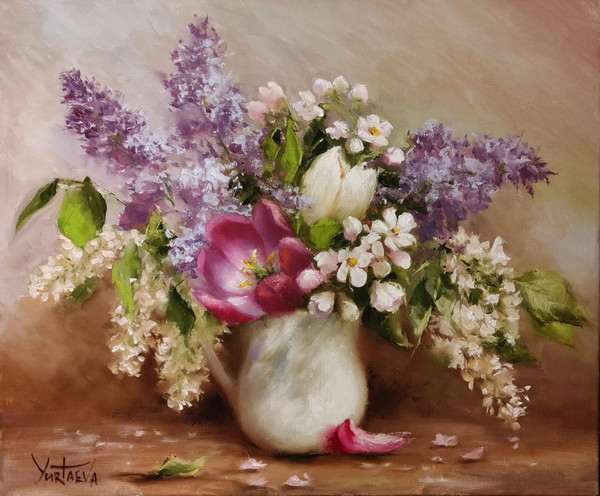 Этот натюрморт с весенними цветами я написала с натуры.Мне послужили натурщиками сирень,яблоня и тюльпаны