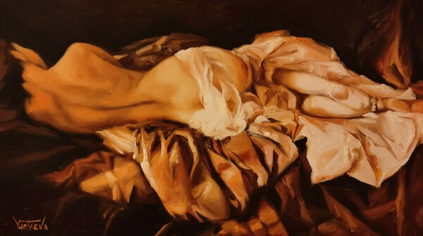 Мне очень нравится писать женское тело,оно совершенно в своих изгибах и пропорциях.Полуобнаженная девушка возлежит,закутавшись в простыни,и возможно медленно.нежась в кровати,пробуждается ото сна. холст масло 40*70см